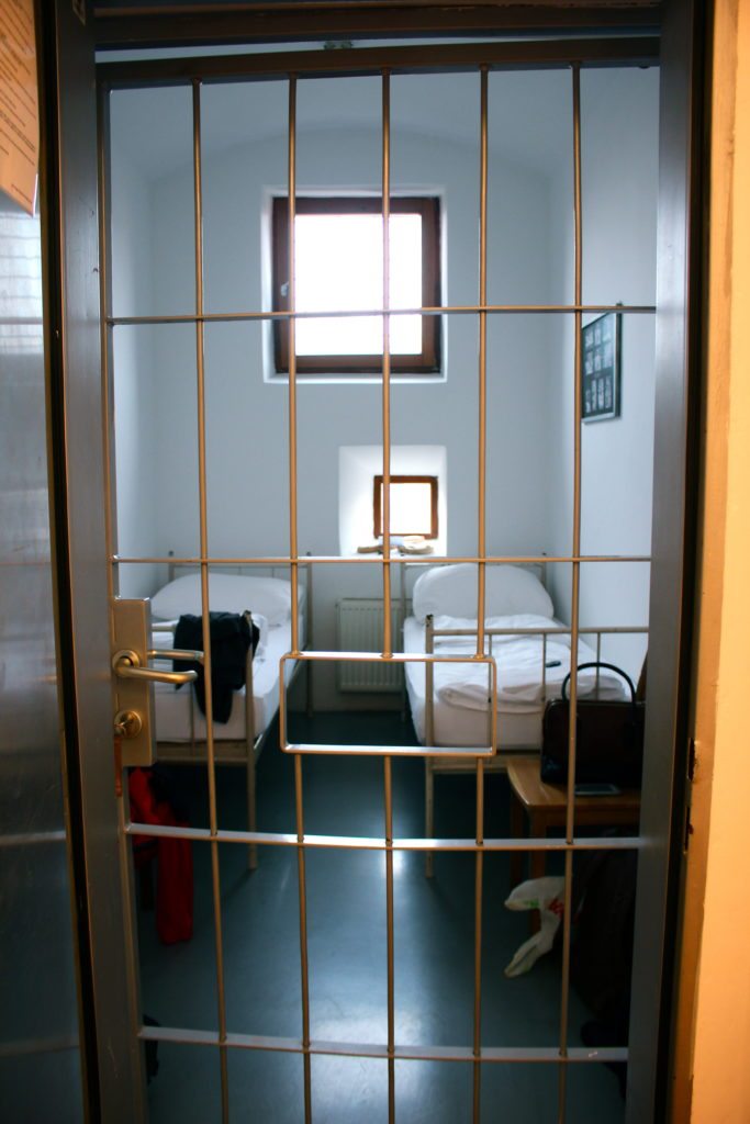 Though each room has bars for doors, just as a jail cell does, from the threshold on every room is unique. Decorated by different artists, the rooms range from funky (one has a circular shaped like an eye) to whimsical (think a gorgeous blue mural) to creepy (mine was decorated just as an old prison was, with white walls, stark beds, and a green linoleum floor). You can check out the hostel, concept behind each room, and learn a bit more about the prison’s history here. Looks like I can officially say I’ve spent the night behind bars!