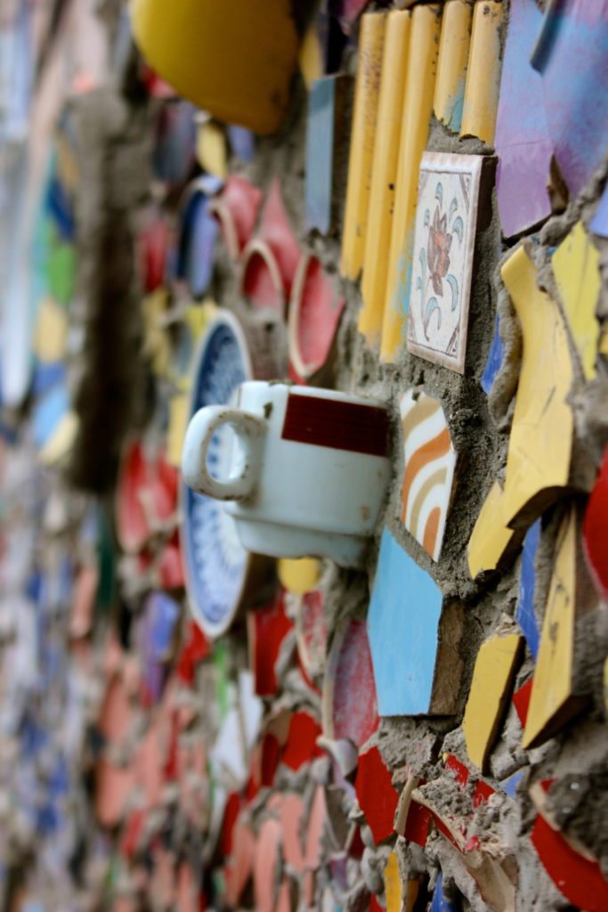 I was particularly drawn in by the wide variety of materials used to create this outdoor art oasis. From the traditional media such as paints and sculpture to the use of old bikes, broken dishes, household items, and other recycled materials, there was something new to discover around every corner.