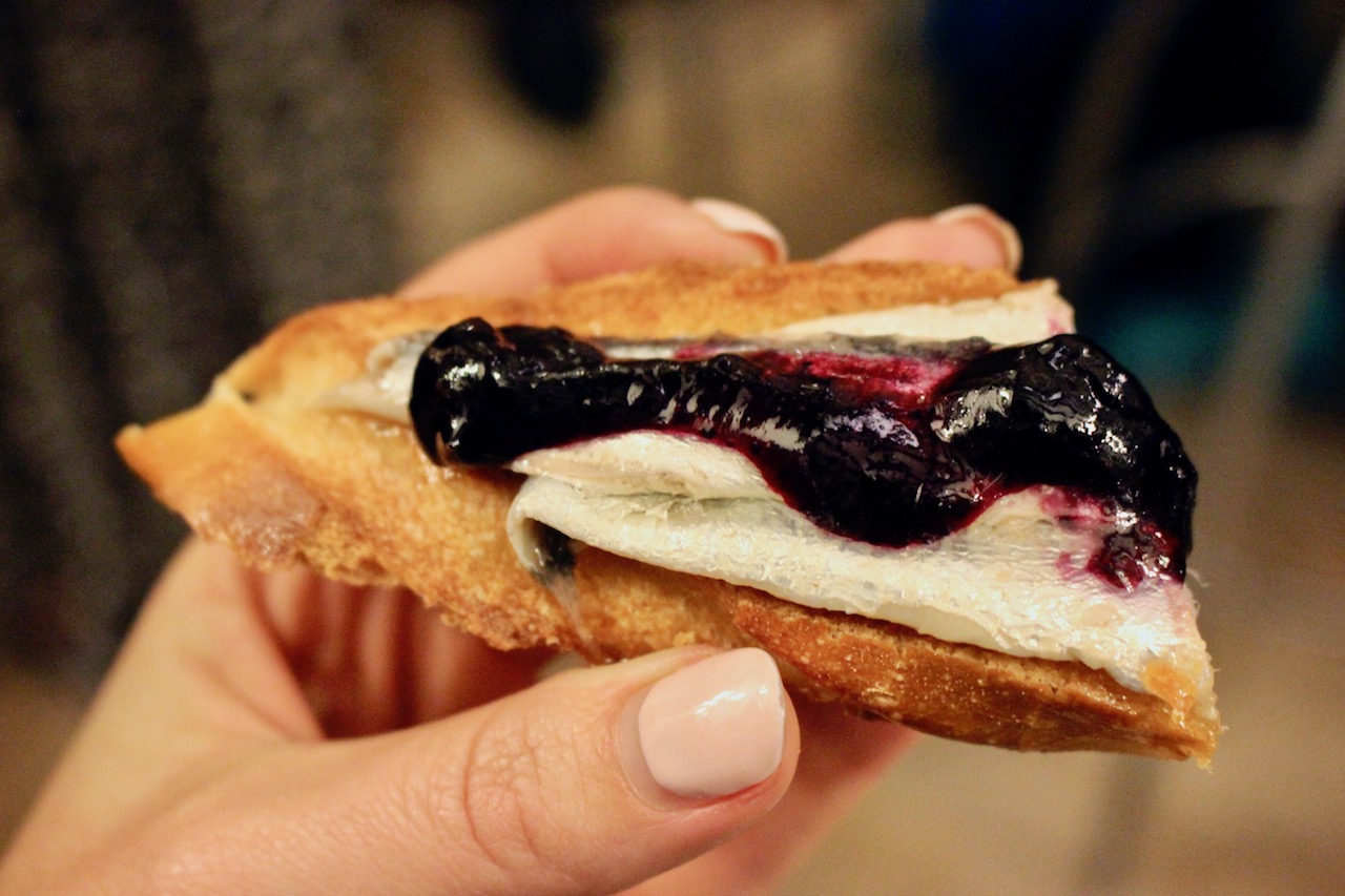 The final pintxo we tried was composed of bread, anchovy, and…blueberries? Yes, you read that right, blueberries! I really enjoyed this surprising flavor combination, and am happy to say that I’ve officially been converted from a former anchovy hater!